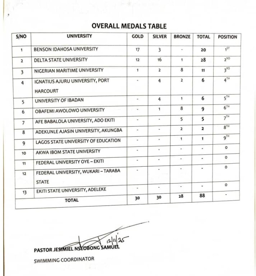 Amidst the promising results, the Nigeria Maritime University (NMU), Okerenkoko, Delta State, emerged as a major success story, acquiring a significant number of medals on the current table.